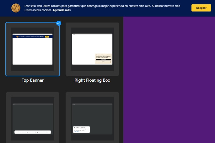 Es un widget que notifica a los visitantes del uso de Cookies en su sitio web vía Pop Up, Banners o notificaciones. Configurable a las necesidades del sitio.